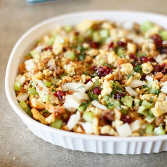 Celery, onions, shallots or garlic, parsley, and fresh or dried sage are the basic and most familiar aromatics for many holiday dressings. Classic complementary ingredients include cooked pork or game sausage, sautéed oysters or giblets, chestnuts, mushrooms, fresh fruit like apples, or dried fruits such as prunes, apricots and cherries, as well as nutmeats and other herbs and spices that not only bring flavor, but also add pleasing and contrasting textures.