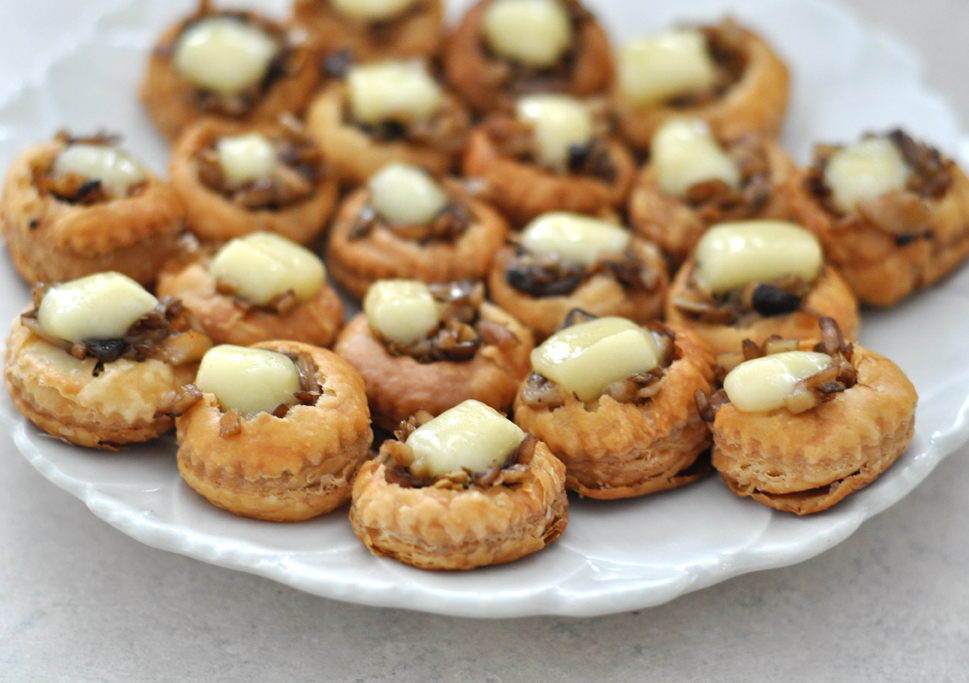 3. Slice brie into small squares, about 1/2″x1/2″x1/4″. Spoon mushroom mixture into tart cups and set on a sheet pan. Place a square of brie on top of each tart, place in a warm oven until just soft. Serve immediately.