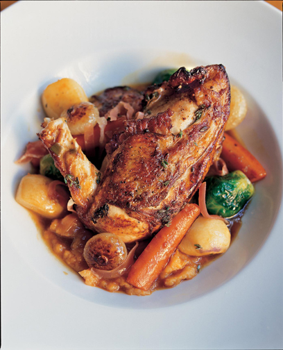 5. Spoon the vegetable purée onto individual plates. Arrange the chicken next to the purée and then the glazed vegetables (if serving) alongside. Garnish with the little strips of country ham.