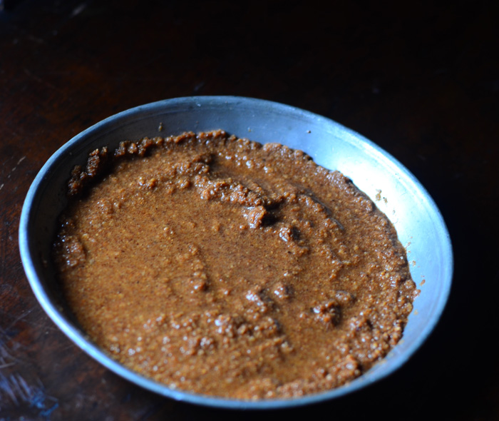 Combine the breadcrumbs with the spices and salt. Add enough vinegar to make a thick sauce and set aside. You can push though a strainer if you want a finer texture.