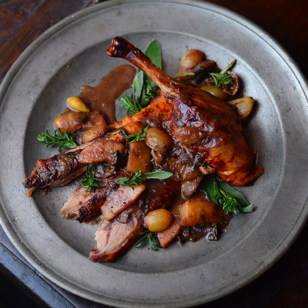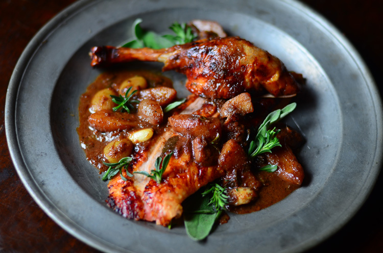 While the mixture is cooking and after the bird has rested 10 minutes, carve the bird into serving pieces and keep warm in a 200º oven while you finish the sauce. Originally these would be speared with a knife and eaten with fingers. Pour the sauce over the duck and serve.