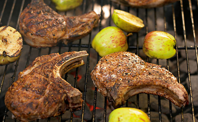 4. Place the chops directly on the cooking grate. Cook for 5 minutes. Flip and cook another 5 minutes for slightly pink and juicy, or to your desired degree of doneness.