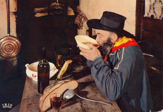 It’s a fun way to finish a bowl of soup. When in Gascony, it is often garbure, an improvised soup that varies by season and from one house to the next, though usually includes cabbage and confit of duck or goose. Some people keep a permanent pot of soup bubbling, and add vegetables and meat to it each day. A good broth is a staple in the day of many rural people.