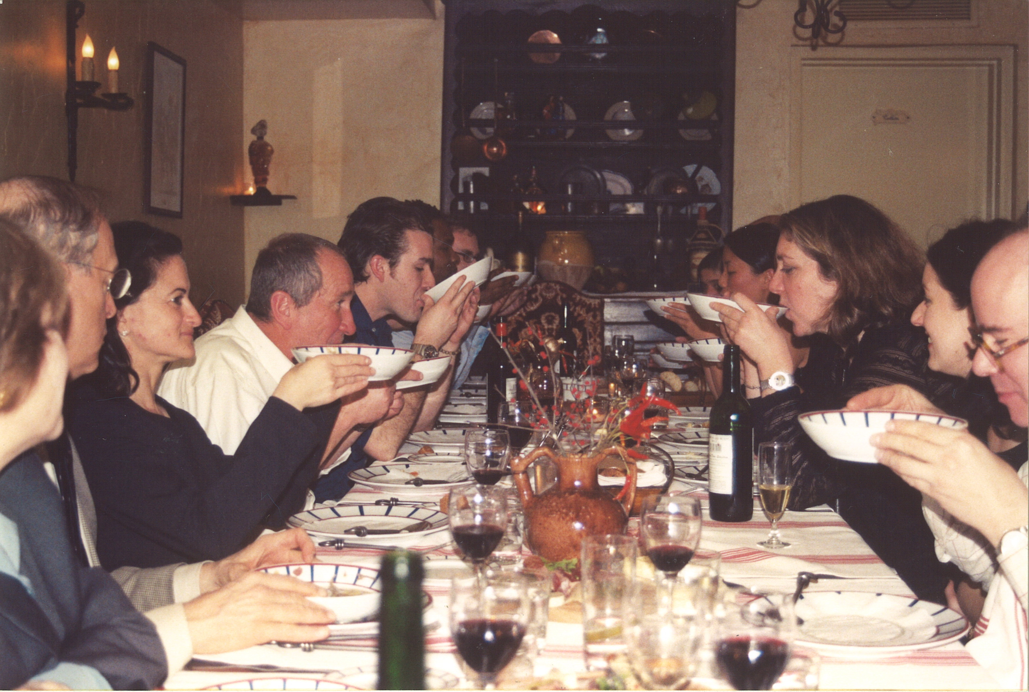 There is no stirring and no spoon! Hold your bowl in two hands, swirl gently, and with elbows planted on the table, drink the wine and broth mixture.