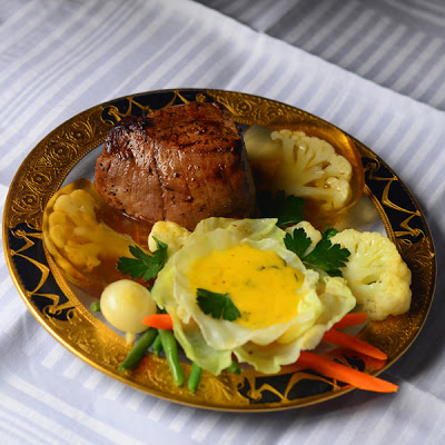 Although you can make the whole tenderloin, I decided that I would do little filets in the style and make cabbage cups of Béarnaise with the vegetables strewn about under the sauce. You can do an old style garnish if you wish ––cauliflower encased in gelée. It’s fun and delicious.
