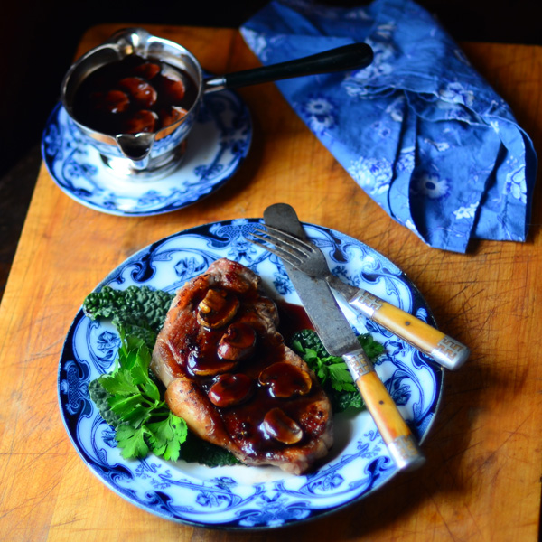 Salt and pepper the steak. Don’t use much salt because the ketchup is salty. Heat a cast-iron skillet till quite hot. Add olive oil to the pan and put the steaks in the pan. Brown each side. The steak will be rare at this point. Cook longer for more doneness. Let rest a few minutes before serving with the mushroom ketchup.