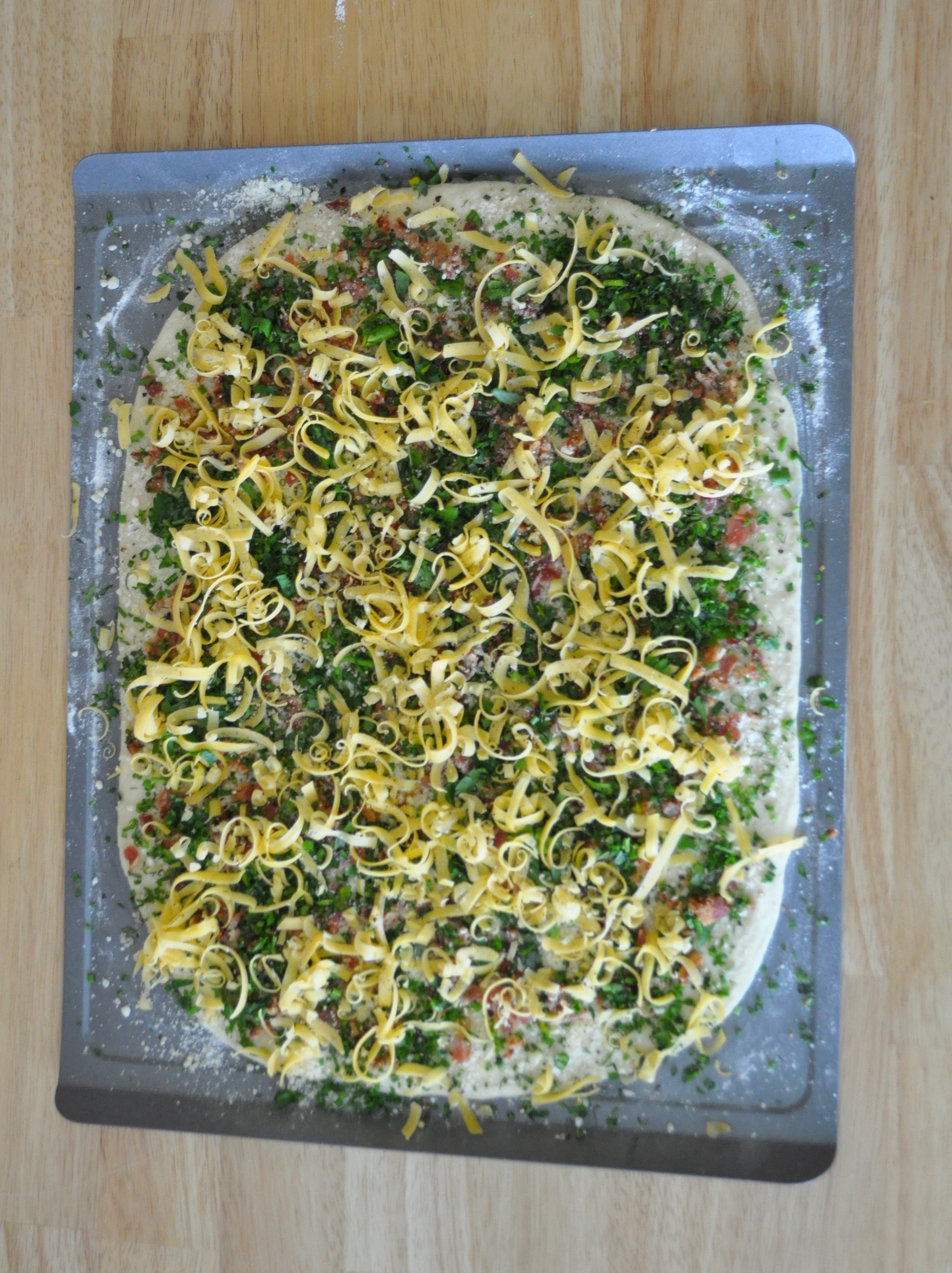 Then add garlic, herbs and cheddar cheese evenly over the dough.