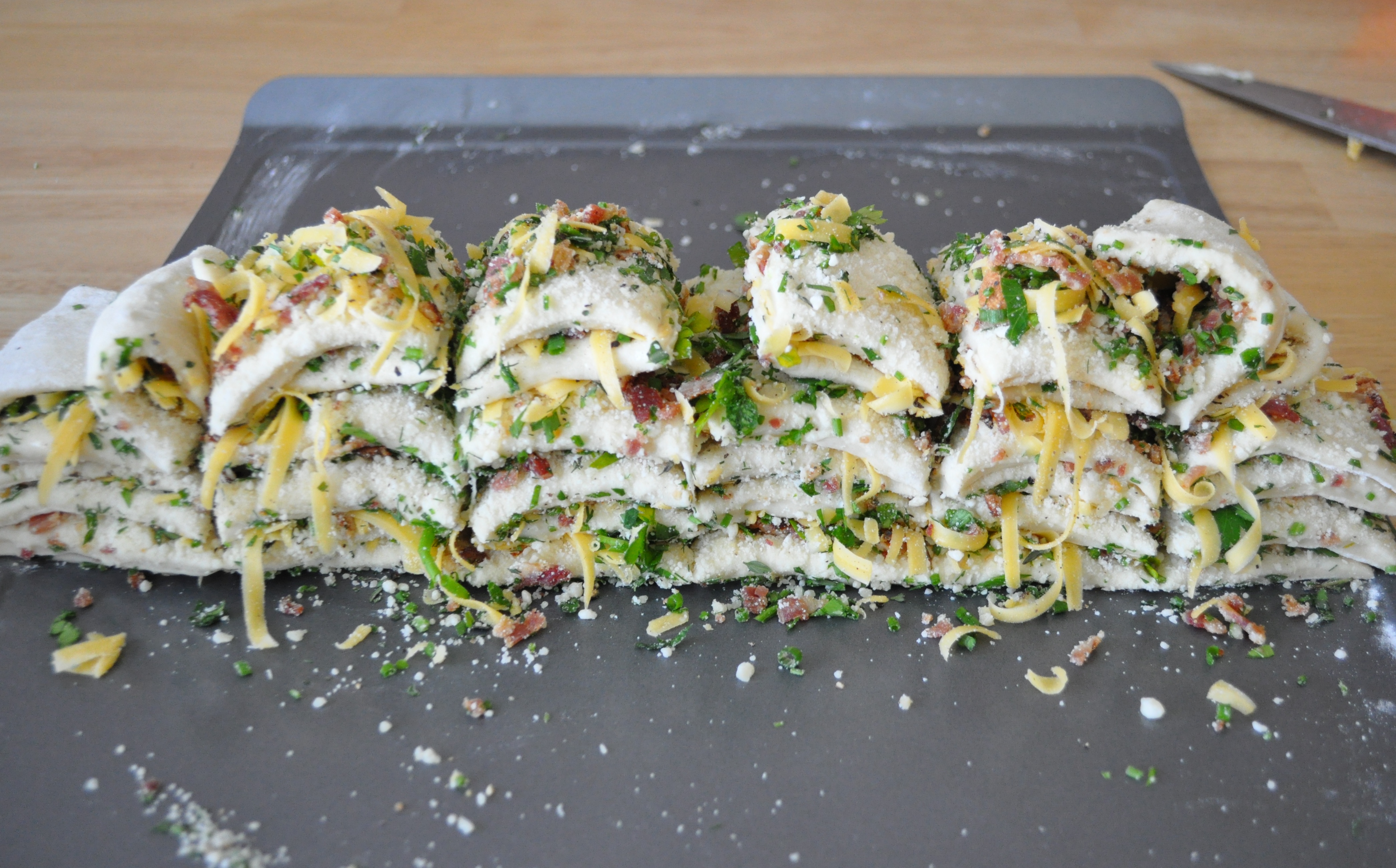 Cut the dough into 6 equally sized strips. A pizza wheel works well for this. Using a large offset spatula to lift the dough, stack the strips on top of each other.