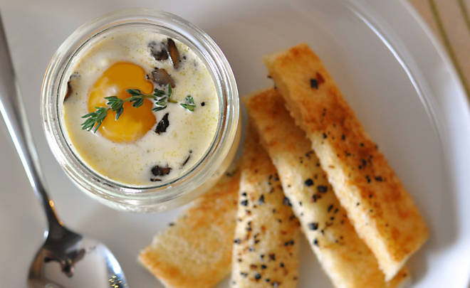 3. Earthy mushrooms and fragrant black truffle butter make this classic eggs en cocotte a standout!